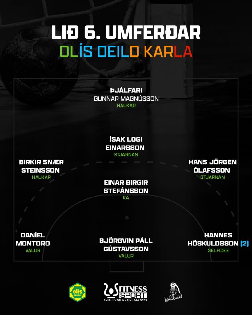 6.umferðin í Olís-deild karla er að baki og hefur Handkastið valið lið umferðarinnar sem er í boði Cell-Tech. Cell-tech kreatínið er fáanlegt í Fitness Sport. Hér að neðan er hægt að sjá úrvalslið 6.umferðar Olís-deildar karla. Leikmaður 6.umferðarinnar er Hans Jörgen Ólafsson leikmaður Stjörnunnar sem átti stórleik í sigri liðsins á Selfossi. Þjálfari 6.umferðarinnar er Gunnar Magnússon þjálfari Hauka. Markmaður: Björgvin Páll Gústavsson (Valur) Þjálfari: Gunnar Magnússon (Haukar) Úrslit 6.umferðar: