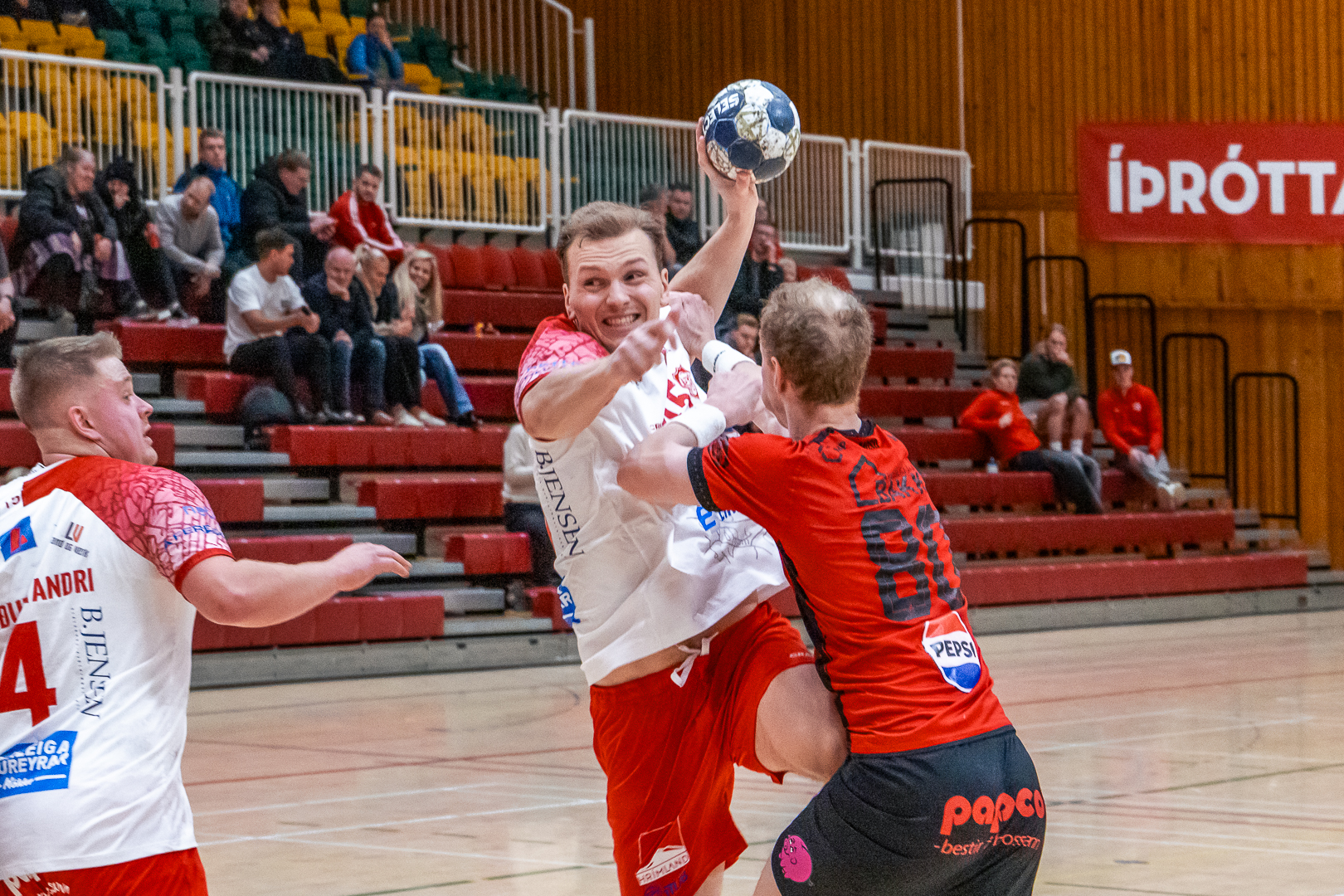 Einn stærsti leikur tímabilsins í Olís-deild karla fer fram í KA-heimilinu á fimmtudagskvöldið þegar Akureyrarliðin, KA og Þór eigast við í 11.umferð Olís-deildar karla. Hefst leikurinn klukkan 19:30. Gera má ráð fyrir tæplega 1000 áhorfendum í KA-heimilinu á fimmtudaginn en gestirnir í Þór fengu 300 miða til sölu hjá sér og samkvæmt heimildum Handkastsins fóru þeir miðar fljótt út. Hafa spjallhópar fyrir norðan á samfélagsmiðlum logað síðustu daga þar sem Þórsarar sem ekki fengu miða hafa reynt að gera allt sem í þeirra valdi stendur til að fá miða. Enn eru þónokkrir miðar eftir fyrir stuðningsmenn KA en þar gera menn ráð fyrir því að síðustu miðarnir á leikinn verða seldir í dag eða á morgun en miðasalan fer einungis fram á ákveðnum tímum í KA-heimilinu. Liðin mættust síðast tímabilið 2020/2021, þann 27.maí þegar heimsfaraldur ríkti í heiminum og voru þeir áhorfendur sem fengu að vera á vellinum með grímur. Þá var fjöldatakmörkun í gildi og því var KA-heimilið ekki fullt. Það verður því allt annað upp á teningnum á fimmtudaginn en síðasti leikur liðanna fór jafntefli 19-19 það tímabil. Þór féll þetta tímabil niður í Grill66-deildina en komust upp í Olís-deildina á nýjan leik á síðasta tímabili. Árni Bragi Eyjólfsson var markahæstur KA-manna í leiknum með fimm mörk á meðan Karolis Stropus var markahæstur í liði Þórs með fimm mörk einnig. Leikurinn verður í opinni dagskrá í Sjónvarpi Símans og það eru algjör forréttindi fyrir íslensku þjóðina að fá annan eins leik sýndan í opinni dagskrá í sjónvarpi allra landsmanna.
