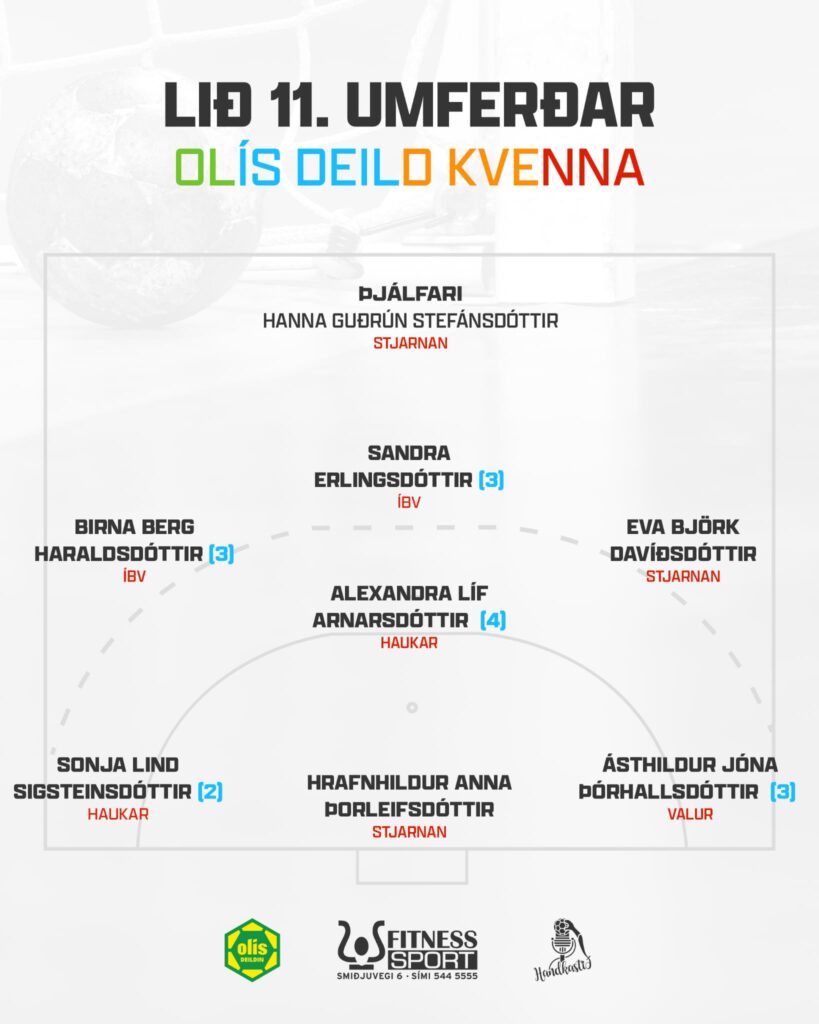 11.umferðin í Olís-deild kvenna er að baki og hefur Handkastið valið lið umferðarinnar sem er í boðiCell-Tech. Cell-tech kreatínið er fáanlegt í Fitness Sport. Hér að neðan er hægt að sjá úrvalslið 11.umferðar Olís-deildar kvenna. Leikmaður 11.umferðarinnar í boði Sage by Saga Sif er Eva Björk Davíðsdóttir leikmaður Stjörnunnar. Hún fær að launum gjafabréf hjá Sage By Saga Sif. Þjálfari 11.umferðarinnar er Hanna Guðrún Stefánsdóttir þjálfari Stjörnunnar.. Cell tech lið 11.umferðar: Mark: Hrafnhildur Anna Þorleifsdóttir (Stjarnan) Þjálfari: Hanna Guðrún Stefánsdóttir (Stjarnan)