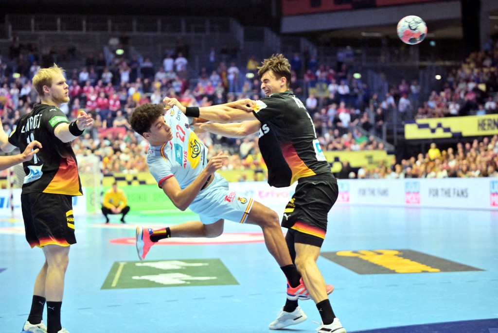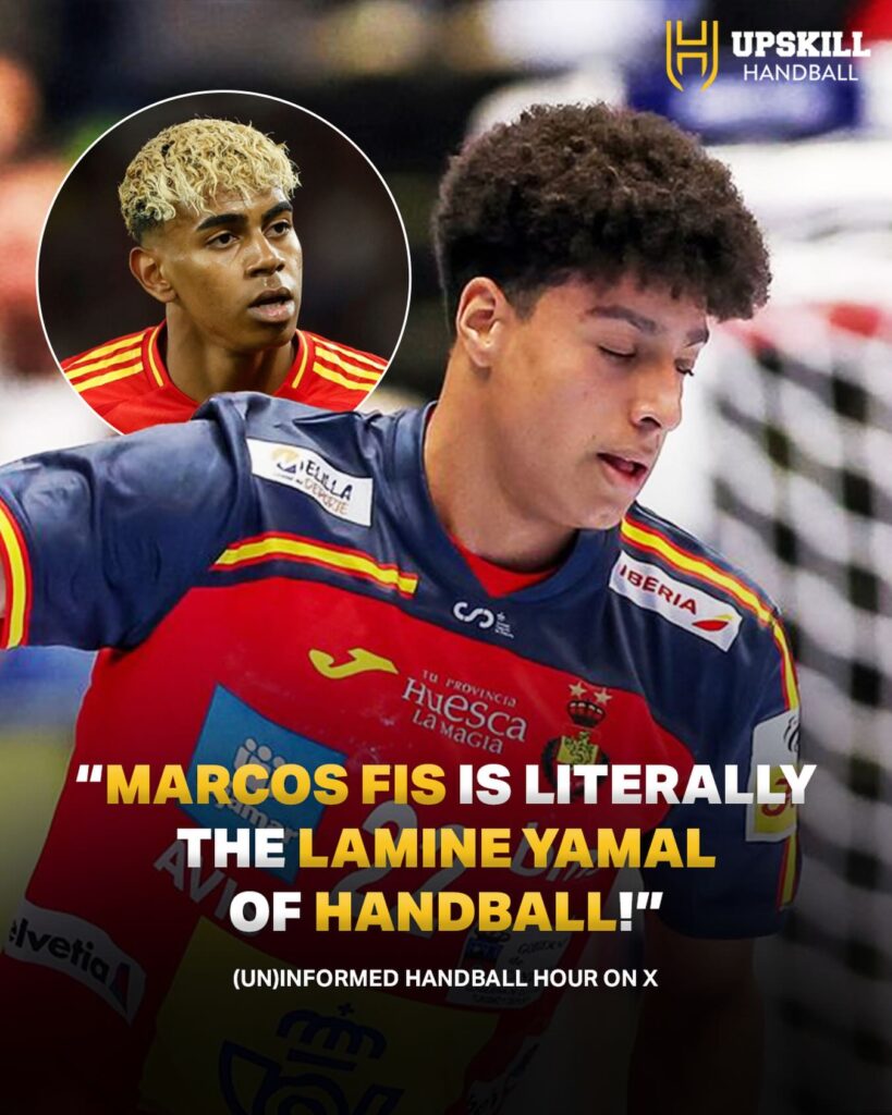 Spánska ungstirnið í handbolta, Marcos Fis hefur vakið mikla athygli í liði Spánar á Evrópumótinu hingað til. Marcos Fis sem er einungis 18 ára gamall hefur skorað átta mörk í fyrstu þremur leikjum sínum á stórmóti. Hann skoraði meðal annars fjögur mörk og gaf tvær stoðsendingar í tapi Spánverja gegn Þjóðverjum í lokaleik riðlakeppninnar. Erlenda handboltahlaðvarpið (Un)informed Handball hour líkti Marcos Fis við spænsku knattspyrnuleikmannninn, Lamine Yamal en báðir eru þeir fæddir árið 2007. Lamine Yamal hefur skotist upp á stjörnuhimininn með frammistöðu sinni hjá Barcelona og spænska landsliðinu en Marcos Fis leikur með Fraikin BM Granollers á Spáni. ,,Átta mörk í fyrstu þremur leikjum sínum, aðeins 18 ára gamall. Samlíkingarnar við Lamine Yamal eru ómögulegt að horfa framhjá," skrifar Upskill Handball á Facebook-ar síðu sína. Fis verður í eldlínunni í dag með Spánverjum þegar Spánn mætir Noregi í fyrsta leik milliriðilsins. Bæði lið hefja leik í milliriðlinum án stig en liðin mætast klukkan 17:00 í dag. Hægt er að sjá mynd af þeim tveimur hér að neðan.