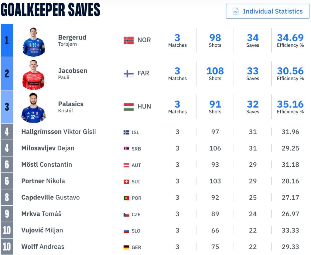 Normaðurinn Torbjørn Bergerud er á toppnum á listanum en hann hefur varið 34 bolta í 98 skotum og er með 34,69% markvörslu. Í öðru sæti er Pauli Jacobsen frá Færeyjum en hann er 33 varða bolta í 108 skotum. Ungverjinn Kristóf Palasics er svo í þriðja sæti með 32 varin skot í 91 skotum.