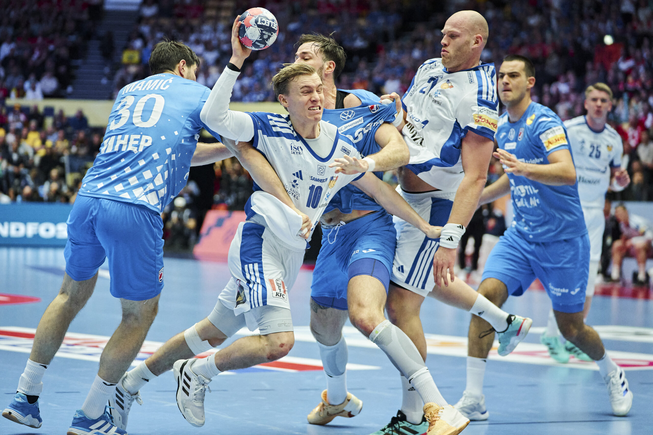 Íslenska landsliðið mætti því Króatíska í leik um þriðja sætið á Evrópumótinu í handbolta í dag. Það er skemmst frá því að segja að Króatar höfðu betur í enn eitt skiptið 33-34. Íslenska liðið byrjaði leikinn af miklum krafti og virtust ætla selja sig dýrt í leiknum en færanýtingin var að þvælast fyrir liðinu í upphafi leiks og fóru leikmenn illa með færin í byrjun leiks. Króatar náðu að byggja upp gott forskot í fyrri hálfleik. Björgvin Páll Gústavsson kom inn með fína innkomu og kom Íslandi aðeins inn í leikinn aftur með fínum vörslum en Króatar leiddu með þrem mörkum í hálfleik 14-17. Strákarnir Okkar voru klaufar allan síðari hálfleikinn og fengu dýrar tvær mínútur þegar við vorum að elta leikinn. Viggó Kristjánsson fékk beint rautt spjald á 37.mínútu þegar hann fór í andlitið á Ivan Martinovic. Ómar Ingi og Gísli Þorgeir héldu uppi sóknarleik Íslands líkt og í fyrri leikjum en varnarlega náðum við illa að ganga út í skyttur Króata. Viktor Gísli kom inná undir lok leiksins og náði að verja 2 vítaskot sem hleypti okkur inn í leikinn en Króatar gerðu svo út um leikinn þegar 20 sekúndur voru eftir þegar þeir komust tveim mörkum yfir. Haukur Þrastarson skoraði lokamark Íslands þegar lokaflautið gall í höllinni og eins marks tap niðurstaða, 33-34. Ísland endar því í fjórða sæti á Evrópumótinu og biðin eftir medalíu á Evrópumótinu verður því ögn lengri. Ómar Ingi Magnússon var markahæstur í liði Íslands með 12 mörk úr 12 skotum en hjá Króötum var Tin Lucin markahæstur með 9 mörk. Björgvin Páll varði 6 skot og Viktor Gísli 5 skot.