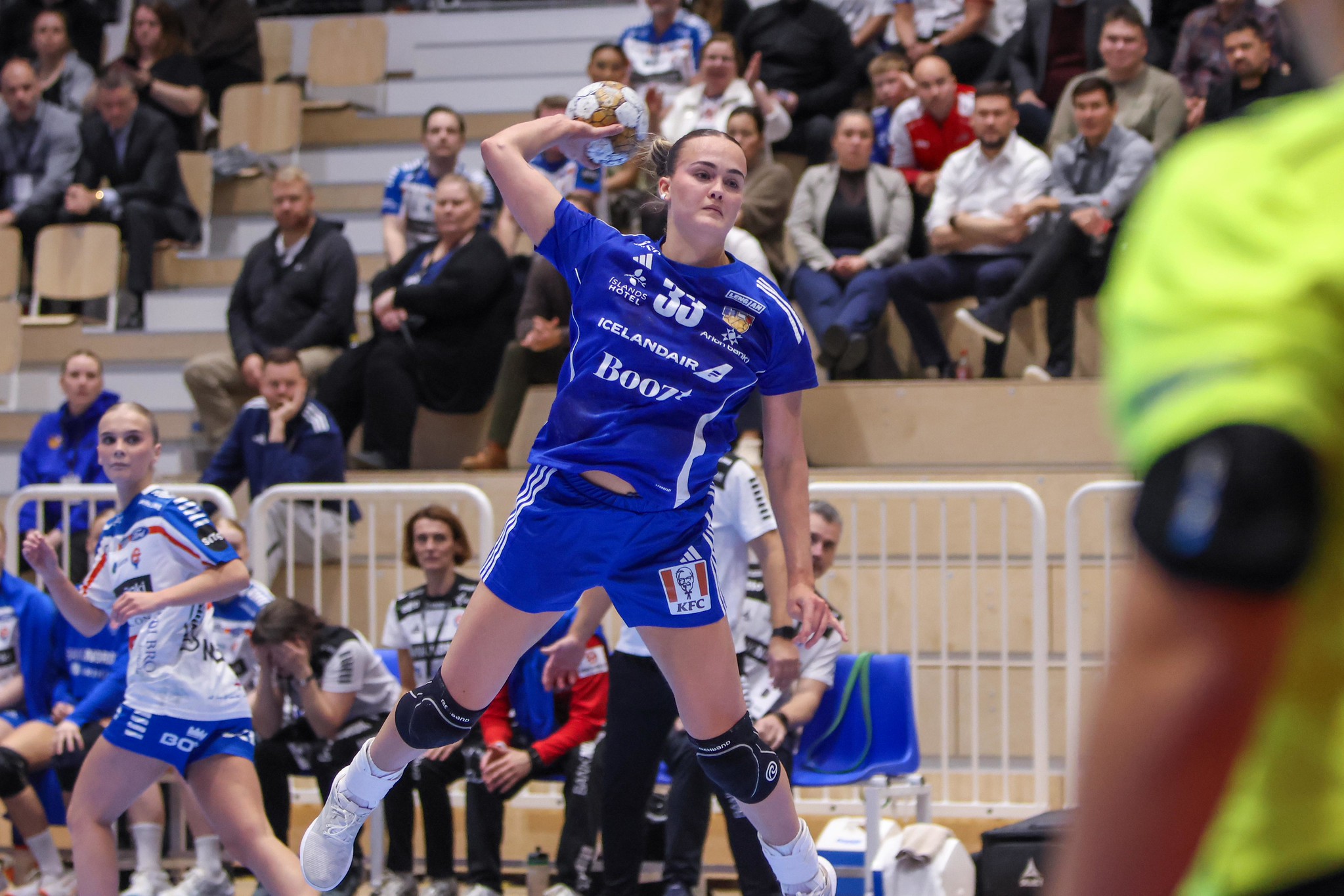 Hvorki Katrín Tinna Jensdóttir línumaður ÍR né Hafdís Renötudóttir markvörður Vals ferðuðust í nótt með íslenska landsliðinu til Svartfjallalands. Þetta staðfesti Arnar Pétursson við Handkastið rétt fyrir flugtak en liðið flaug til Póllands rétt eftir miðnætti en stelpurnar okkar fljúga svo til Podgorica höfuðborgar Svartfjallalands í morgunsárið. Báðir leikmennirnir fengu þær höfuðhögg í sigri Íslands gegn Svartfjallalandi í gær sem endaði með eins marks sigri 28-27. Arnar Pétursson segir að það sé ljóst að Katrín Tinna taki ekki þátt í leiknum á sunnudag. Katrín Tinna fékk högg á gagnaugað í byrjun leiks og kom ekkert frekar við sögu í leiknum. Arnar sagði við Handkastið í gærkvöldi að ef Hafdís yrði betri í dag verður henni flogið út á föstudaginn. Ethel Gyða Bjarnasen markvörður Fram var kölluð inn í landsliðið seint í gærkvöldi og ferðaðist með liðinu í nót. Ethel Gyða lék upp öll yngri landslið Íslands en hún á engan A-landsleik á bakinu. Þá staðfesti Arnar Pétursson að Alexandra Líf Arnarsdóttir leikmaður Hauka fari með landsliðinu út en hún var í leikmannahópi Íslands í gærkvöldi en kom þó ekkert við sögu í leiknum. Síðari leikur Íslands og Svartfjallalands í undankeppni EM fer fram á sunnudaginn og hefst klukkan 17:00 að íslenskum tíma. Um er að ræða fjórða leik þjóðanna í riðlinum. Íslenski hópurinn eins og staðan er í dag fyrir leikinn gegn Svartfjallalandi: Markverðir: Aðrir leikmenn: