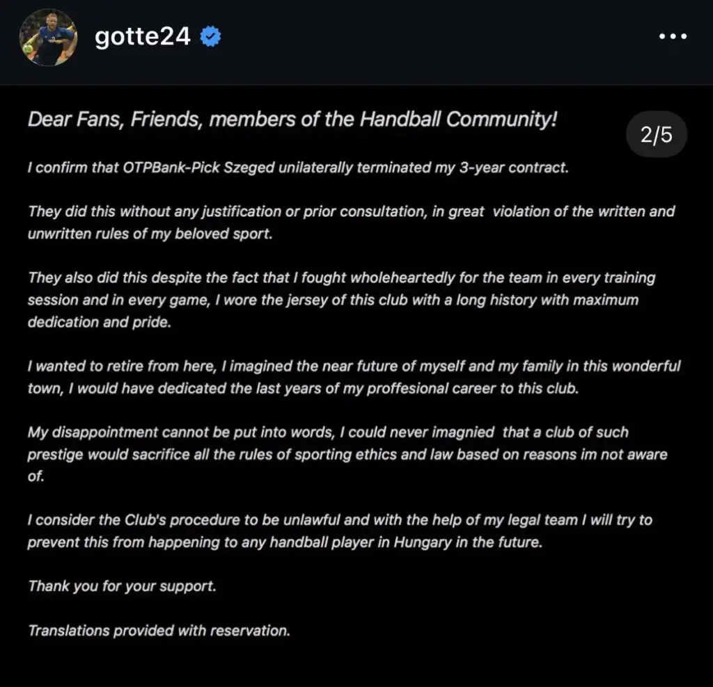 Sænski landsliðsmaðurinn, Jim Gottfridsson greindi frá því í kvöld að ungverska handknattleiksliðið Pick Szeged hafi rift þriggja ára samningi hans án fyrirvara. Í yfirlýsingu sinni segir hann ákvörðunina hafa komið sér algjörlega á óvart og að engar skýringar hafi fylgt. Handkastið greindi frá málinu fyrr í vikunni. Gottfridsson hyggst leita réttar síns gagnvart félaginu vegna málsins. Athygli vekur að þjálfari Pick Szeged, Michael Apelgren, er jafnframt landsliðsþjálfari sænska karlalandsliðsins þar sem Jim Gottfridsson leikur. Hann gekk til liðs við Pick Szeged á síðasta ári eftir að hafa undirritað þriggja ára samning og hafði gert ráð fyrir að ljúka ferlinum þar. „Mér er orðavant,“ segir hann meðal annars í tilkynningunni en hann hafði leikið í fleiri fleiri ár með Flensburg áður en hann gekk í raðir Pick Szeged. Fyrr í dag staðfesti Pick Szeged að samningi hans hefði verið sagt upp, í kjölfar óstaðfestra frétta undanfarna daga um að Svíinn væri fallinn í ónáð hjá félaginu. Landsliðsmaðurinn, Janus Daði Smárason leikur með Pick Szeged en gengur í raðir Barcelona í sumar. Pick Szeged komst á dögunum áfram í 8-liða úrslit Meistaradeildar Evrópu. Hér að neðan má sjá yfirlýsingu sænska landsliðsinsmannsins sem hefur verið orðaður við endurkomu til Flensburg.