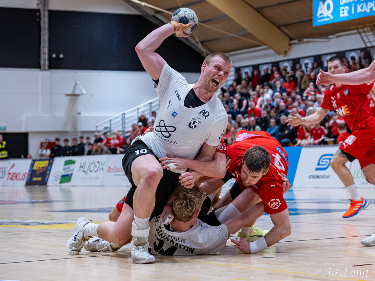 Valur leiðir í einvíginu um Íslandsmeistaratitilinn eftir fjögurra marka sigur gegn FH í fyrsta leik úrslitaeinvígisins í Valsheimilinu í gærkvöldi 37-33. Staðan var jöfn í hálfleik 16-16. Í upphafi seinni hálfleiks var heldur betur umdeilt atvik sem átti sér stað þegar Jón Bjarni Ólafsson leikmaður FH fékk að líta rauða spjaldið frá dómurum leiksins, þeim Bjarka Bóassyni og Gunnari Óla Gústafssyni. ÉG FÆ ÞETTA ALDREI TIL AÐ VERA RAUTT SPJALD - Sigursteinn Arndal þjálfari FH var allt annað en ánægður með ákvörðun dómarana í viðtal eftir leik eftir að hafa séð atvikið í sjónvarpinu eftir leikinn. Nýttu dómararnir tæknina og fóru í VAR og eftir að hafa horft á atvikið ítrekað var þeirra ákvörðun að gefa Jóni Bjarna rautt spjald. Rætt var um atvikið í uppgjörsþætti Handkastsins: